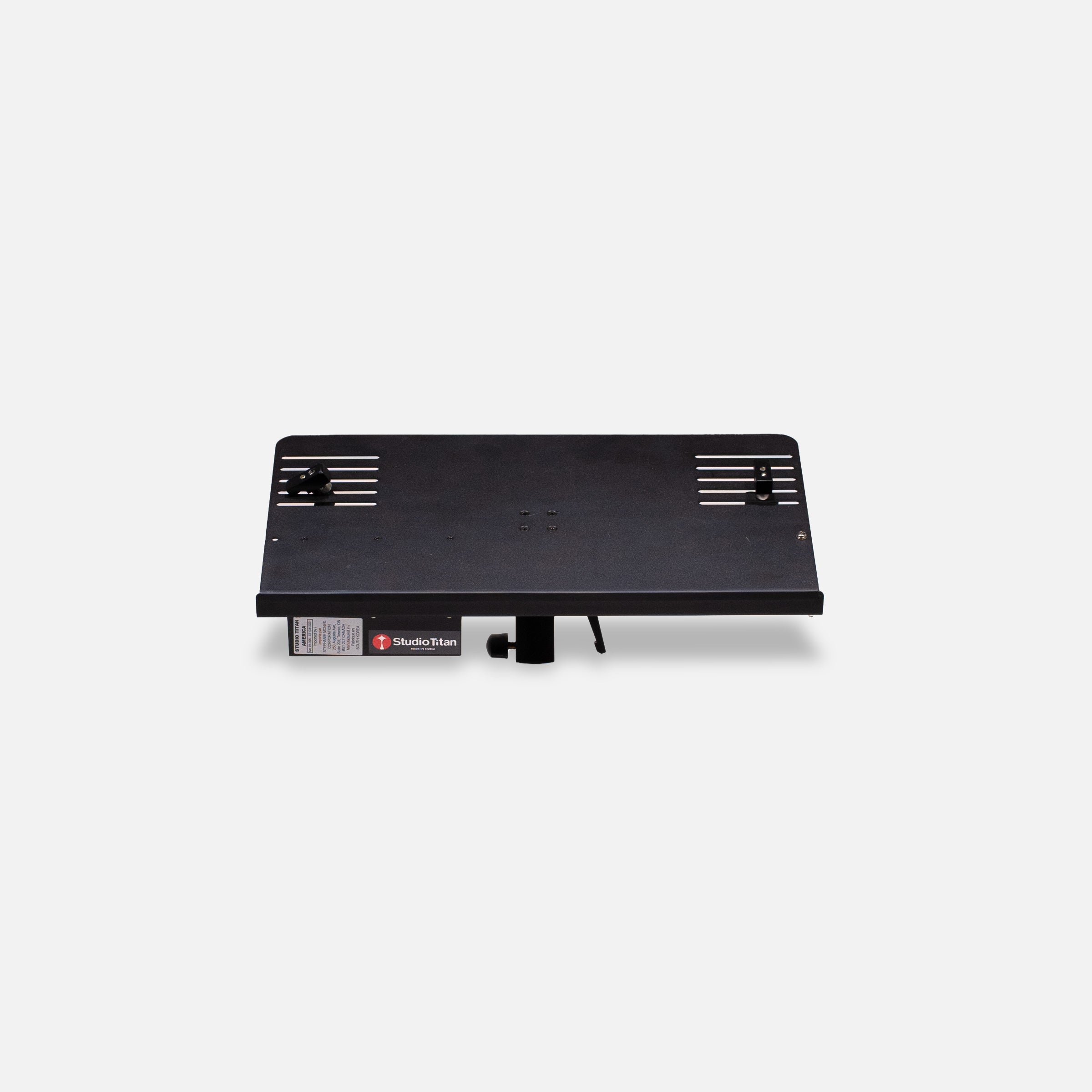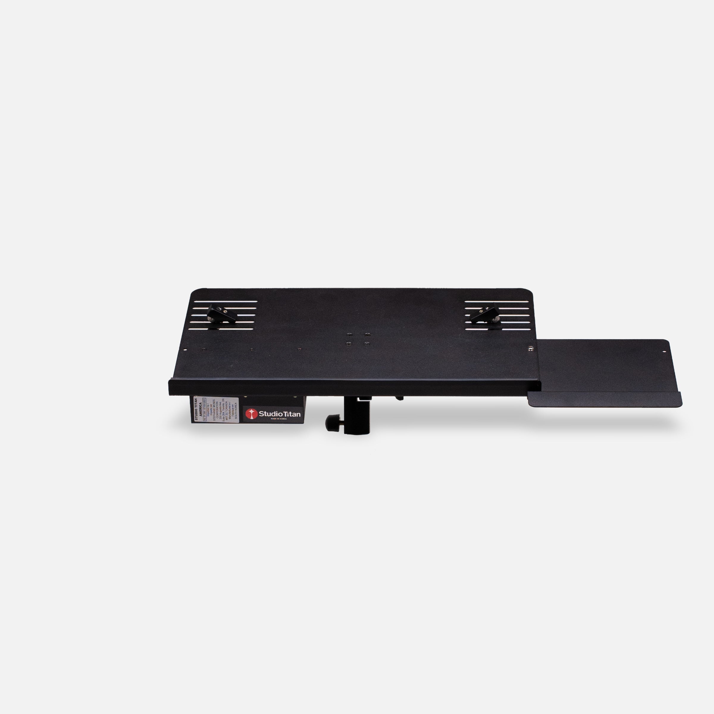 The STA-01-395 Large Digital Imaging Accessory Shelf is designed specifically to attach to and extend the capabilities of our primary products. It can be used to hold and secure a 13-17 inch Notebook Computer for tethered shooting. It is supplied complete with an extension mouse shelf and integrated compartment for use with an external hard drive, power supply or external battery. The Large Digital Imaging Accessory Shelf provides a one-inch lip to prevent the Notebook from sliding forward during use. Two Metal, height-adjustable, Notebook Friendly Clamps securely hold the Notebook in place by clamping the Notebook on each side to the Shelf. A unique feature of the Large Digital Imaging Accessory Shelf, not found on other products, is the user adjustable tilt angle. The user can adjust the angle of the shelf for personal preference and reduced screen glare. The Large Digital Imaging Accessory Shelf is rigid and designed for daily commercial use. It is manufactured using sheet steel that is approximately 5/64ths [ 1.9mm] in thickness. The Detachable Pivot Arm allows the shelf to be repositioned, forward and back and is precision manufactured from solid aluminum with attention to detail using CNC machinery. Compatible for use with all Studio Titan America Stands. The Large Digital Imaging Accessory Shelf can also be mounted on top of a C-stand, light stand or 5/8th inch stud.