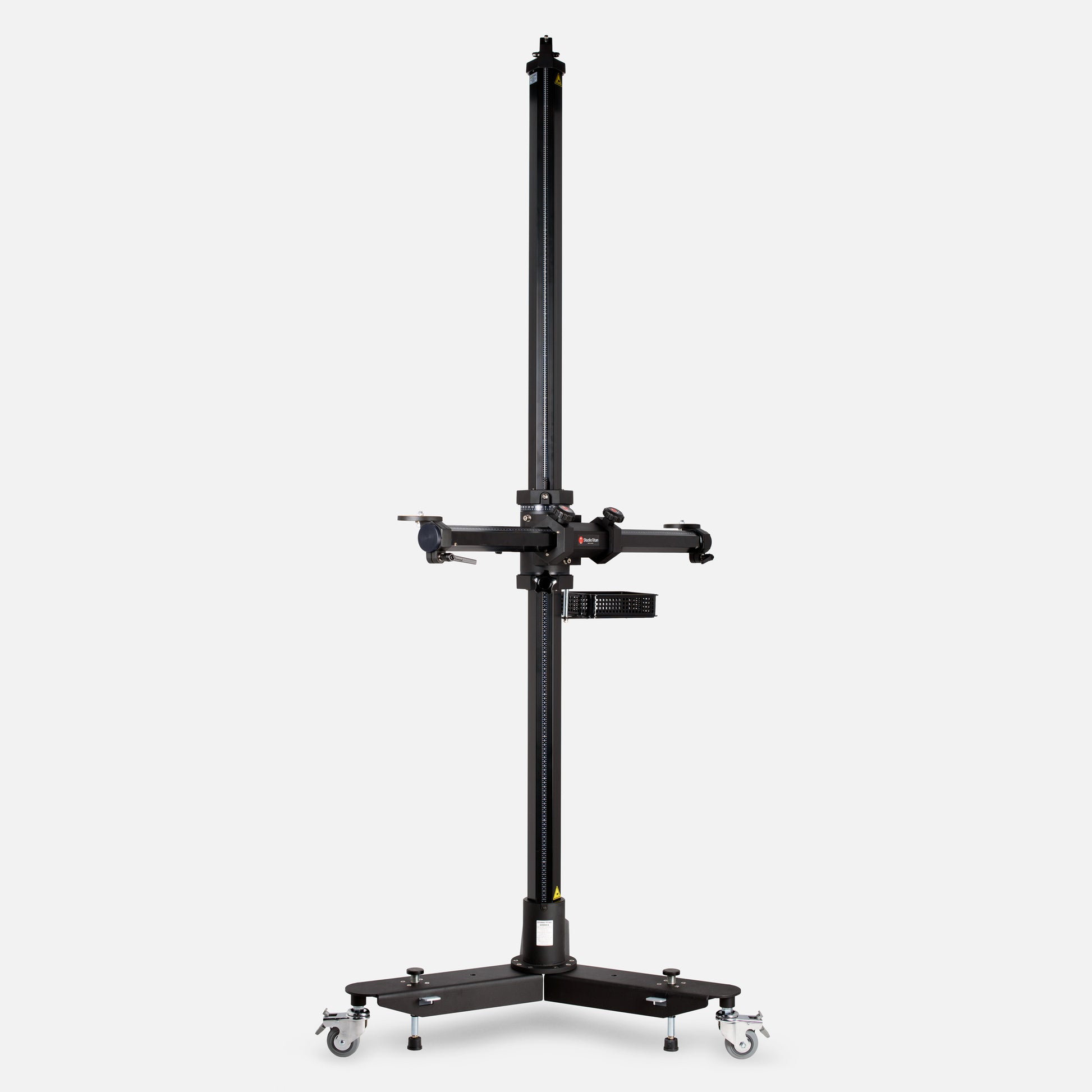 The STA-01-350R-MK2 is a rotating camera stand designed for commercial photography and optical measurement systems. It features a center column height reaching 240cm/94.4 inches and a horizontal arm width of 100cm/39.3 inches. The base is heavily weighted for added stability.