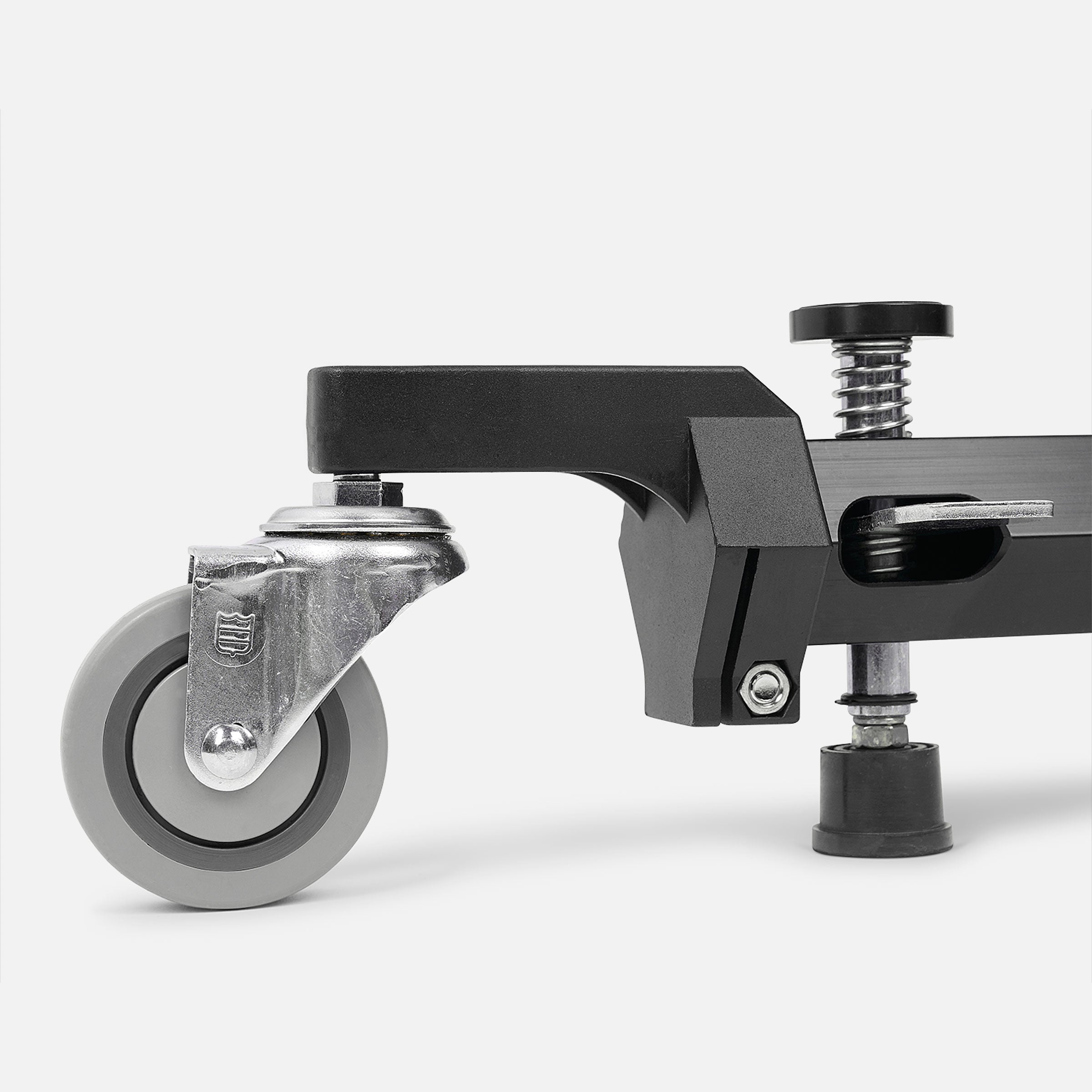 -Low center of gravity base with foot-operated brake plungers, quickly secures base and dampens vibrations.